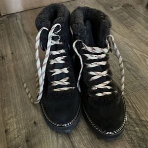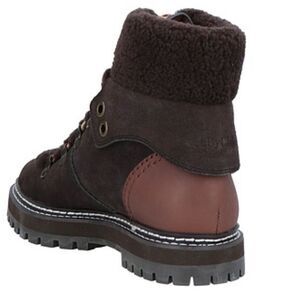hiking boots, leather, solid color, brand logo, lined in shearling, lace-up, round toe, flat, lug sole, contains non-textile parts of animal origin