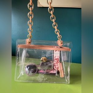 Stylish purse, see through with brass chain strap and closure. Like new! 8” distance from shoulder to top of bag.