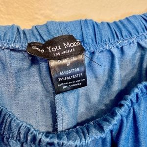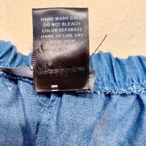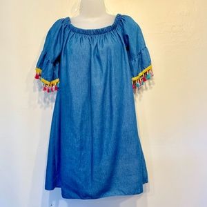 See you Monday Chambray Denim Tunic Dress with Rainbow Tassel Off Shoulder Style Short Bell Sleeves