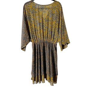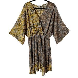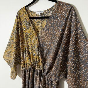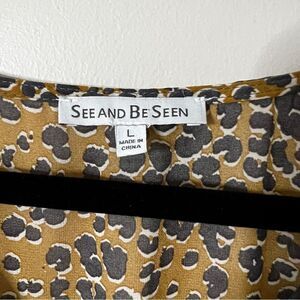 See And Be Seen 3/4 Sleeve V Neck Animal Print Two Tiered Ruffle Dress. Size Large. Cross over front with a small stitch closure. Wide sleeves. Elastic waist. Top is semi sheer. Excellent used condition!