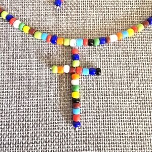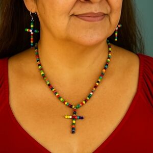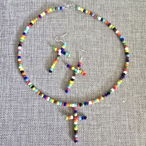 Seed Bead Colorful Rainbow Cross Pendant Necklace Earrings Set