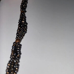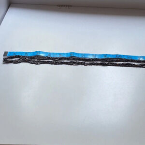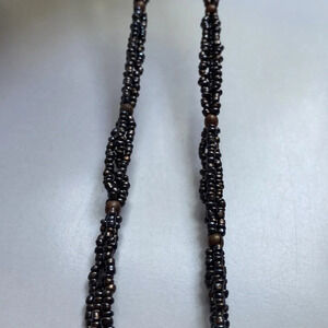 Three strands of seed beads connected with bronze beads every 1.5 inches or so.