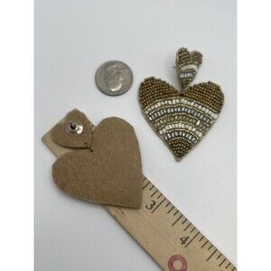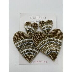 Fun seed bead double heart dangle drop earrings. In colors of gold, white and silver. Has felt backing. Drops approximately 2 3/4 inches. Comes brand new on DAPPLED boutique earring card. Comes for smoke free home.