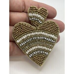 Seed Bead Gold White & Silver Double Heart Dangle Earrings New