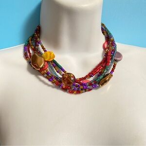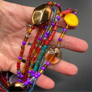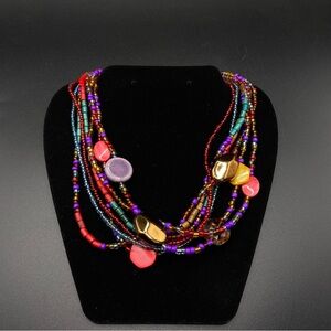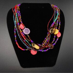 Seed Bead Multi Strand Red Gold Purple Colorful Necklace. Measures 16"+3" extender chain. Beautiful seed bead necklace has 7 strands with multiple colors, mostly red, purple, turquoise, blue and gold. Eight large glass focal beads and wood beads are strategically placed to make this a stunning statement necklace. Very good condition. #32