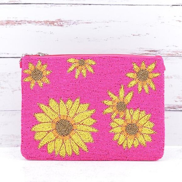 Seed Bead Sunflower Clutch Crossbody Handbag Bag NEW Pink