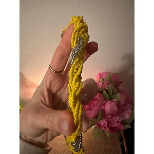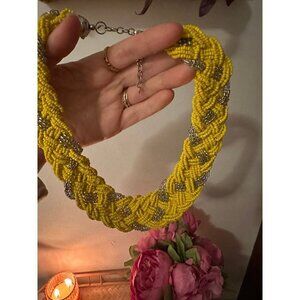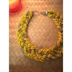 Seed Bead Woven Statement Necklace, Yellow-Silver, 17 inches