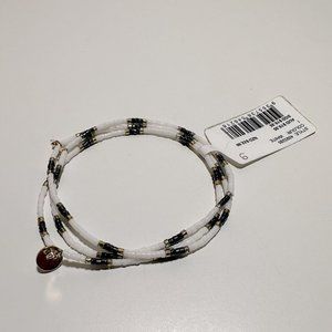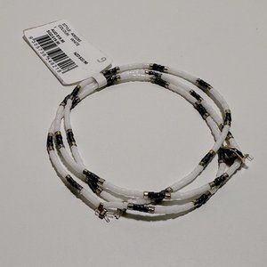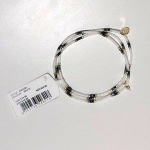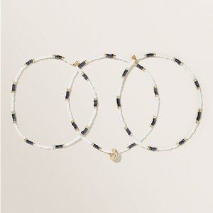 These stretch bracelets are strung with delicate, white glass beads, punctuated with pops of navy blue and gold. Mini disc charms decorate the bracelets, which are presented in a set of three.