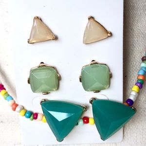 3 pair faceted plastic pierced earrings gold tone, triangle shaped 6/8” medium to dark green- sage green square almost 1/2” - pale yellow small triangle 3/8”. #seedbead #seedbeadjewelry