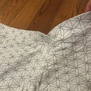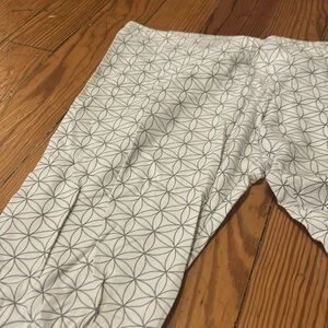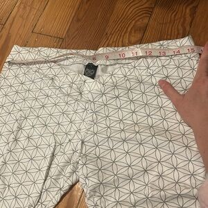 Stylish white pants featuring a geometric pattern. Ruffle hem adds a playful touch.