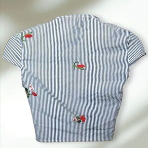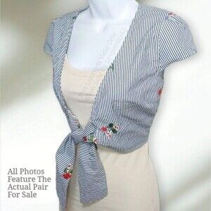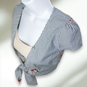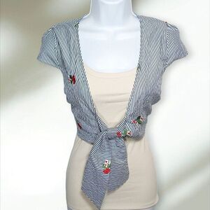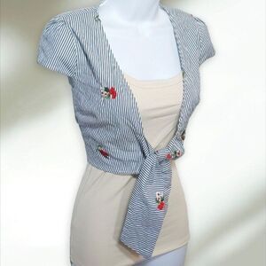 Seersucker Blue Stripe Red Floral Embroidered Tie Waist Bolero Blouse Top Medium