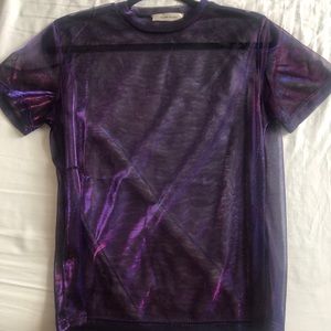 This is a purple medium size see-through mesh top. It has only been worn once, smoke free and pet free home.