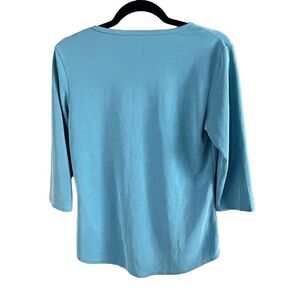 Details: V-neck, 3/4 sleeves, pretty blue “silky feel”.