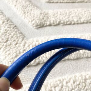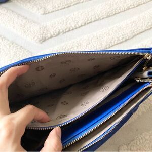 Large royal blue leather, removable strap, gold hardware, several pockets and dust bag included.
