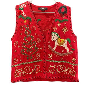 Segue Red Ugly Christmas Rocking Horse Button Front Vest Size Small
