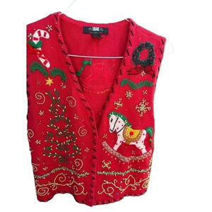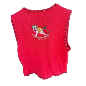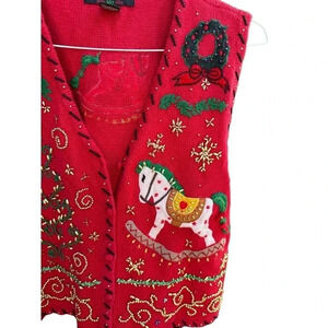 Segue Women's Red Christmas Gold Beaded Rocking Horse Sweater Vest Size Large