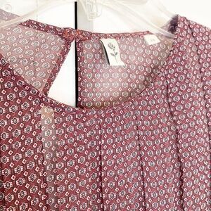 In excellent preowned condition. Semi-sheer. Pleated front. Elastic waistband. Button sleeves. Keyhole back with button closure. Brand tag with the signature black rose on the front. No material/care tag.