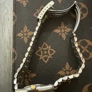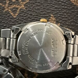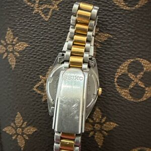 Ladies vintage Seiko watch features two tone stainless steel bracelet band w/ fluted bezel crown and sunburst gold face