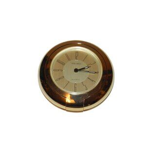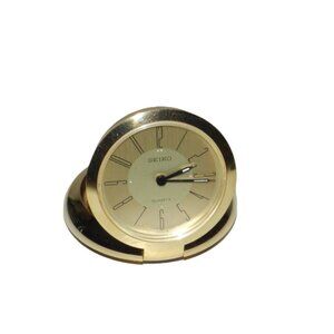This vintage Seiko travel alarm clock is a beautiful addition to any collection. It features a round metal frame with a gold finish and a battery-operated quartz movement. Its luminous hands and analog display make it easy to read the time, even in the dark.
