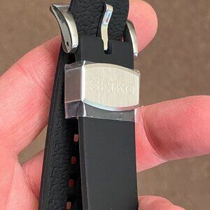 The item is a stainless steel Seiko automatic divers watch. The case measures 12.8 millimeters thick and 43.8 millimeters round. The watch has both automatic and manual wind and it has 23 jewels. The watch has a threaded crown and case back and is water resistant up to 200 meters or 660 feet. The sapphire crystal has a anti-reflective coating on the inner surface. The dial has a date calendar and has glow in the dark hands and markers. The watch has a unidirectional rotating bezel. The strap is made of silicone and the lug width is 22 millimeters. The watch has a stop second hand function. The watch will come with a three year warrant and we will include the paper work inside the box.