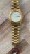 Description: Gold-tone dial with day and date windows. Gold-tone bracelet, case, hands, and markers. Just cleaned and serviced with a new battery installed. Works well!