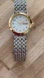 Description: Beautiful new stainless steel weave bracelet. Gold-tone case and crown. White dial with day and date windows. Gold-tone and luminous markers and hands. Just cleaned and serviced with new battery! Works well!