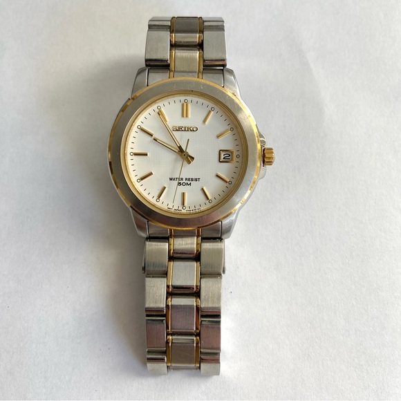 The Seiko Men's Watch V742-8119 is a classic timepiece featuring a two-tone gold and silver design with a day/date movement. This watch has a round stainless steel case with a polished finish and a fixed gold bezel. The watch also includes non-numeric hour marks and stick indexes, creating a stylish and sophisticated look. With a water resistance of 50m (5 ATM), this wristwatch is durable and reliable for everyday wear. Made in Japan, this Seiko watch is a perfect choice for those looking for a timeless and elegant timepiece for their career or casual style.