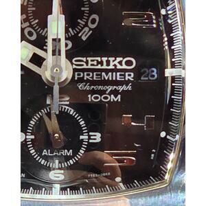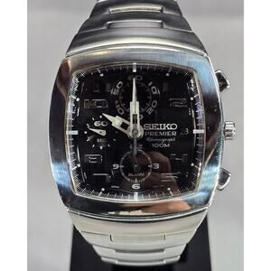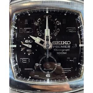 Up for sale is the elegant and versatile Seiko Premier Chronograph 7T62-0BG0, featuring a black Roman numeral dial, sharp dauphine hands, and timeless dress styling. This piece offers both refined looks and practical functionality, powered by Seiko’s ultra-reliable 7T62 quartz chronograph movement.Manufactured in October 2014, this watch is in very good condition, showing only light signs of wear. All functions are working properly—including the chronograph, alarm/subdial (which can be used as a second time zone), and quickset date.Key Features:Model: Seiko Premier ChronographReference: 7T62-0BG0Serial Number: 40XXXXCase Diameter: 42mm (approx)Lug Width: 20mmDial: Black with Roman numeralsMovement: Seiko 7T62 quartz (chronograph + alarm/dual time)Crystal: Sapphire Water Resistance: 100M (not pressure tested)Condition: Very Good – minor surface wearStrap: OEM Bracelet