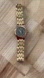 Description: Rare watch! Stunning carbon fiber looking dial with gold-tone hands and markers. Date window. Gold-tone stainless steel case and bracelet with hidden closure and push-button clasp. Just cleaned and serviced with a new battery installed. Works well!