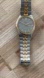 Description: Rare vintage watch. Gray dial with day and date windows. Two-tone bracelet. Gold-tone and luminous hands and markers. Just cleaned and serviced with a new battery installed. Works well!
