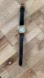 Description: Solar powered watch. Gorgeous white round dial in gold-tone case. Black and gold-tone hands and markers. Black genuine leather strap. Just cleaned and serviced. Works well!