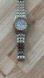 Description: Solar powered watch. White dial, black and gold-tone hands and markers, fold-over clasp with push button. Two-tone stainless bracelet. Day and date windows. Just cleaned and serviced. Works well!