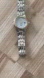 Description: Solar powered watch. Beautiful white dial with date window. Gold-tone hands and markers. Fold over clasp with push button. Two-tone stainless bracelet. Just cleaned and serviced. Works well!