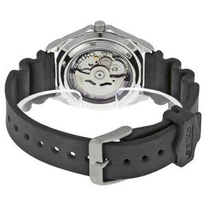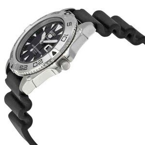 Black dial enhanced by luminous hands. Silver-tone stainless steel case with a black rubber band. Automatic movement. 100 meters / 330 feet water resistance. Uni-directional Rotating bezel. Scratch Resistant Hardlex crystal. Skeleton caseback. Tang clasp. Case size 43 mm x 13 mm.
