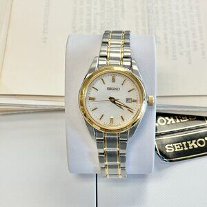 The item is a two tone stainless steel Seiko women's watch. The watch case measures 8.3 millimeters thick and 29.8 millimeters round. The case back is threaded. The band width is 14 millimeters. There is a date calendar at the 3 position on the dial. The hands and markers glow in the dark. The watch has a sapphire crystal and is water resistant up to 10 bar. The watch is battery operated and will come with a three year warranty and we will provide the box.