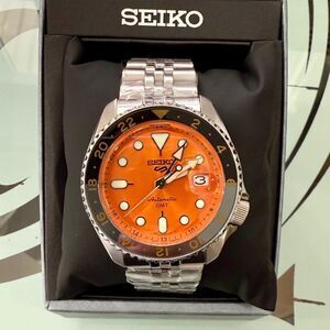 Seiko watch featuring an orange dial and silver band. Black bezel with GMT function.