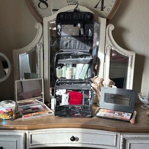 This listing is photos of my personal bag, best travel bag ever! The bag includes a zip off brush holder, large pockets to carry essentials for travel. I take it everywhere with me. You will receive a brand new bag, if you would like to visit my Seint site, I would appreciate it!