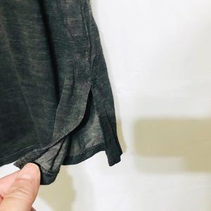 This women's Sejour Semi Sheer Short Sleeve T Shirt is in a size 2X, and it is NEW WITH TAGS. There is a scoop neck, it is semi-sheer, has 2 small vents on the sides, and the color is charcoal grey, The shirt is also asymmetrical.
