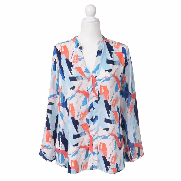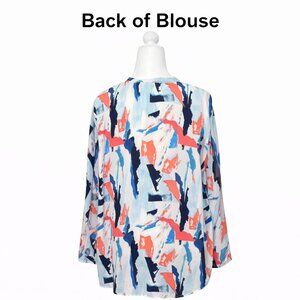 This Sejour plus size tunic blouse (18W) features a bold abstract geometric print with orange, blue, navy, and white accents. Designed in a relaxed pullover tunic style, this blouse offers an easy, flattering fit ideal for everyday wear, casual work outfits, or travel.