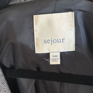 The Sejour blazer is a women's plus-size basic jacket in size 16, featuring a classic herringbone pattern in gray. It is crafted from a blend of polyester, rayon, and spandex for the outer shell, with a polyester lining. The blazer includes a three-button front closure, a classic notch lapel, and long sleeves with button accents. Suitable for professional settings or casual outings, this versatile piece is made in China. The blazer is pre-owned.