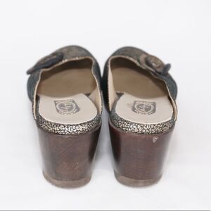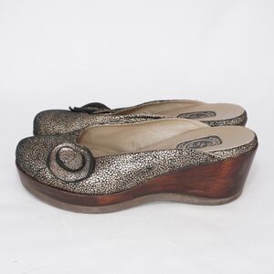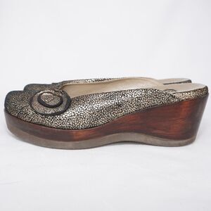 Slip-on wedges from Selby with black & gold upper and wooden wedge heel