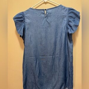 Select + Trend soft denim top with ruffle front and cap sleeves, polyester and rayon, excellent condition, size M.