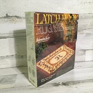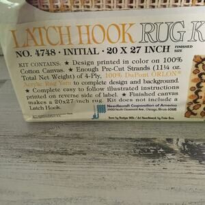 This is a New, Unopened Wonder Art Latch Hook Rug Kit # 4748 Initial. Select your own initial from the diagrammed alphabet printed on reverse side of label. Finished size: 20" x 27". Includes: full color design printed on canvas, pre-cut 100% Dupont ORLON Acrylic rug yarn, and easy to follow instructions. Latch hook not included. The box does have damage crush to top-- does not effect contents of box. There is a rip in the plastic on on the front.