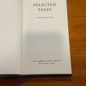 This hardcover edition of "Selected Tales" features some of Edgar Allan Poe's most intriguing stories. Carefully preserved, it offers a classic reading experience with its elegant design. Published by The Peebles Classic Library, this book is a valuable addition to any literary collection, showcasing timeless tales of mystery and imagination.