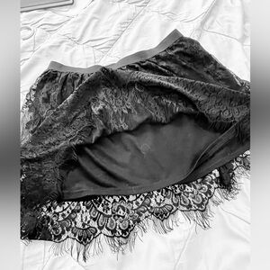 This chic black mini skirt by Selena Gomez features a playful style with lace, perfect for a cocktail night out. Its design adds a touch of flair, making it a standout piece for any evening occasion. Elastic waist. Will fit medium to extra large