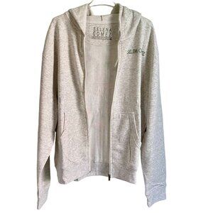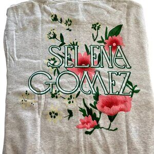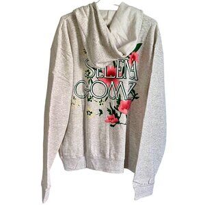 Soft gray hoodie featuring a striking floral design and "Selena Gomez" text. Comfortable fit and durable material blend for everyday wear.