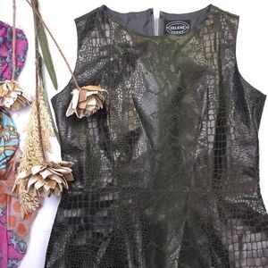 This elegant sleeveless dress features a stunning green hue, perfect for any occasion. Its sleek design offers a sophisticated look.