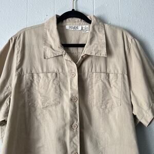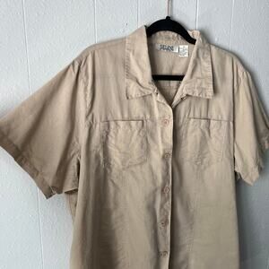 Selene Sport women's shirt in beige. Collared. V-neck. Button down. Short sleeves. Chest pockets. Side slits. Lightweight. Has a few stains, please see last two pictures. Not extremely visible. In good used condition. No tears or holes.