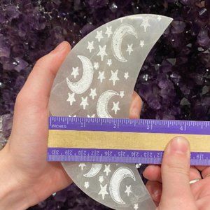 This listing is for one Selenite Moon Etched Charging Plate. The charging plate is approximately 6” long but each piece is hand made and varies in length, width and height. The selenite is genuine material sourced from Morocco and the etching are hand done, not computer or laser printer.