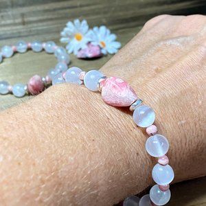 BEAD SIZE: The Selenite beads are 8mm, the Rhodochrosite round Beads are 4mm, the Raw Rhodochrosite Focal Bead is 6-9mm.